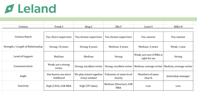 To help you evaluate all of your options for choosing someone to write your business school letter, we recommend making a side-by-side comparison. To do that, try using our helpful Recommender Chart. Fill in the criteria for each recommender; as you go, you may also want to assign numeric values for each criterion to facilitate your final decision.